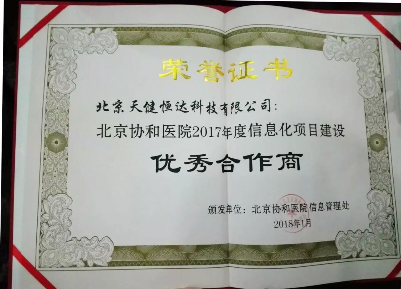 2010年開始,天健連續(xù)多年被北京協(xié)和醫(yī)院評(píng)為“信息化項(xiàng)目建設(shè)優(yōu)秀承建商”和“信息化項(xiàng)目建設(shè)優(yōu)秀合作商”,2018年1月,天健再獲此殊榮。與此同時(shí),天健的項(xiàng)目人員也被授予“2017年度北京協(xié)和醫(yī)院信息化建設(shè)優(yōu)秀服務(wù)人員”的稱號(hào)。