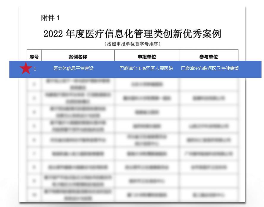 天健客戶巴彥淖爾市臨河區(qū)人民醫(yī)院憑借“醫(yī)共體信息平臺建設應用”在全國257個案例中突出重圍,獲評“2022年度醫(yī)療信息化管理類創(chuàng)新優(yōu)秀案例 ”,為推動醫(yī)療信息化建設的持續(xù)發(fā)展、公立醫(yī)院高質(zhì)量發(fā)展發(fā)揮典型案例示范引領作用。